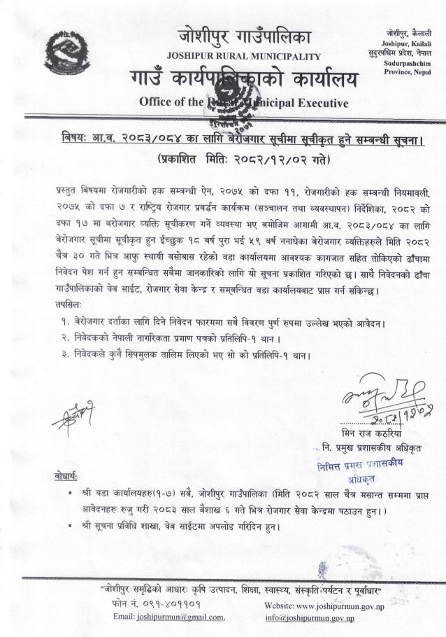आ.व.२०८३/०८४ का लागि बेरोजगार सूचीमा सुचीकृत हुने सम्बन्धी सूचना ।