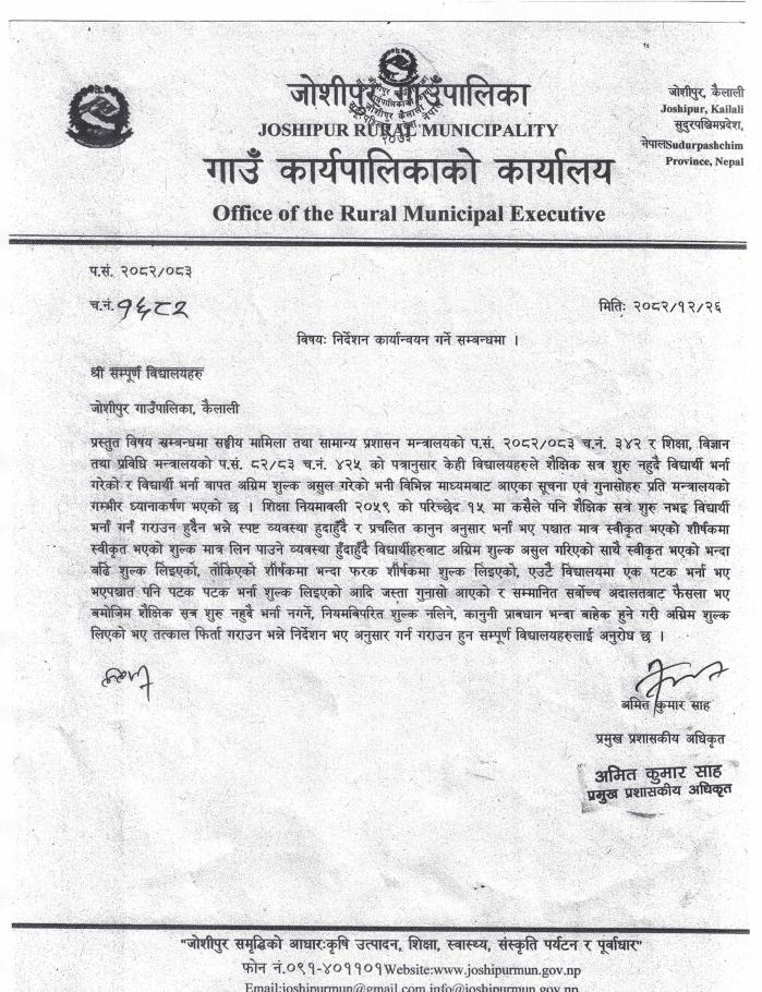 निर्देशन कार्यान्वयन गर्ने सम्बन्धमा । (श्री सम्पूर्ण विद्यालयहरु)
