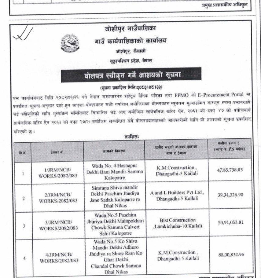 बोलपत्र स्वीकृत गर्ने आशयको सूचना ।