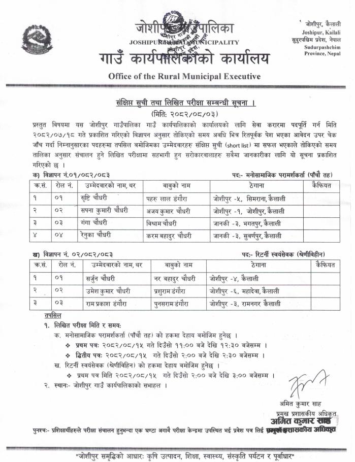 संक्षिप्त सुची तथा लिखित परीक्षा सम्बन्धी सूचना ।