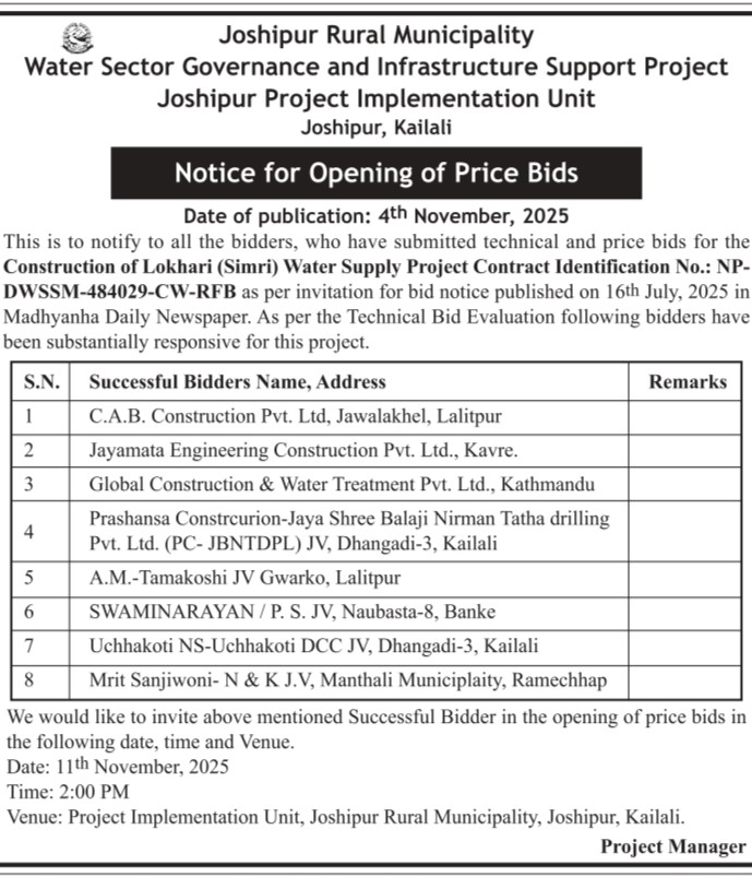 Notice for Opening of Price Bids