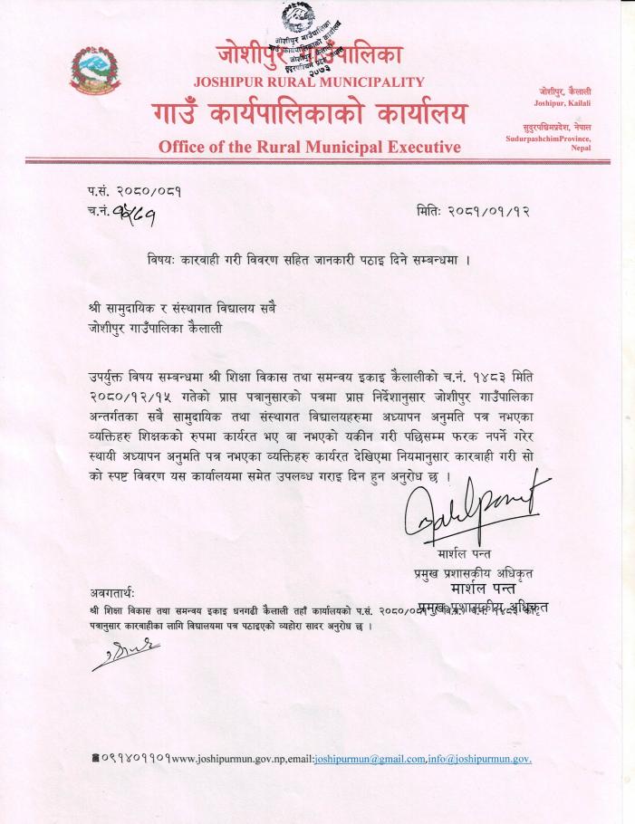 कारवाही गरी विवरण सहित जानकारी पठाई दिने सम्बन्धमा । (सामुदायिक र संस्थागत विद्यालय सबै)