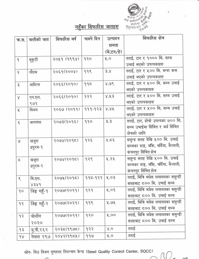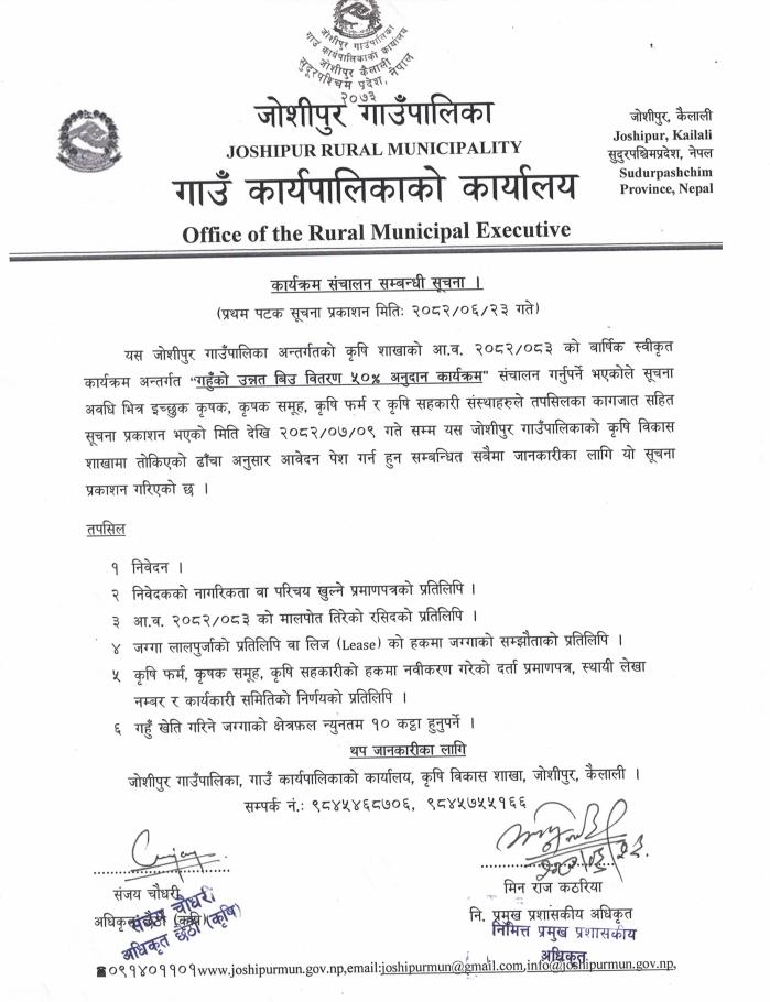 गहुँको उन्‍नत बिउ वितरण ५०% अनुदान कार्यक्रम संचालन सम्बन्धी सूचना ।
