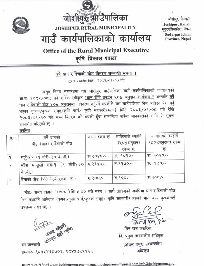 बर्षे धान र ढैँचाको बीउ वितरण सम्बन्धी सूचना ।