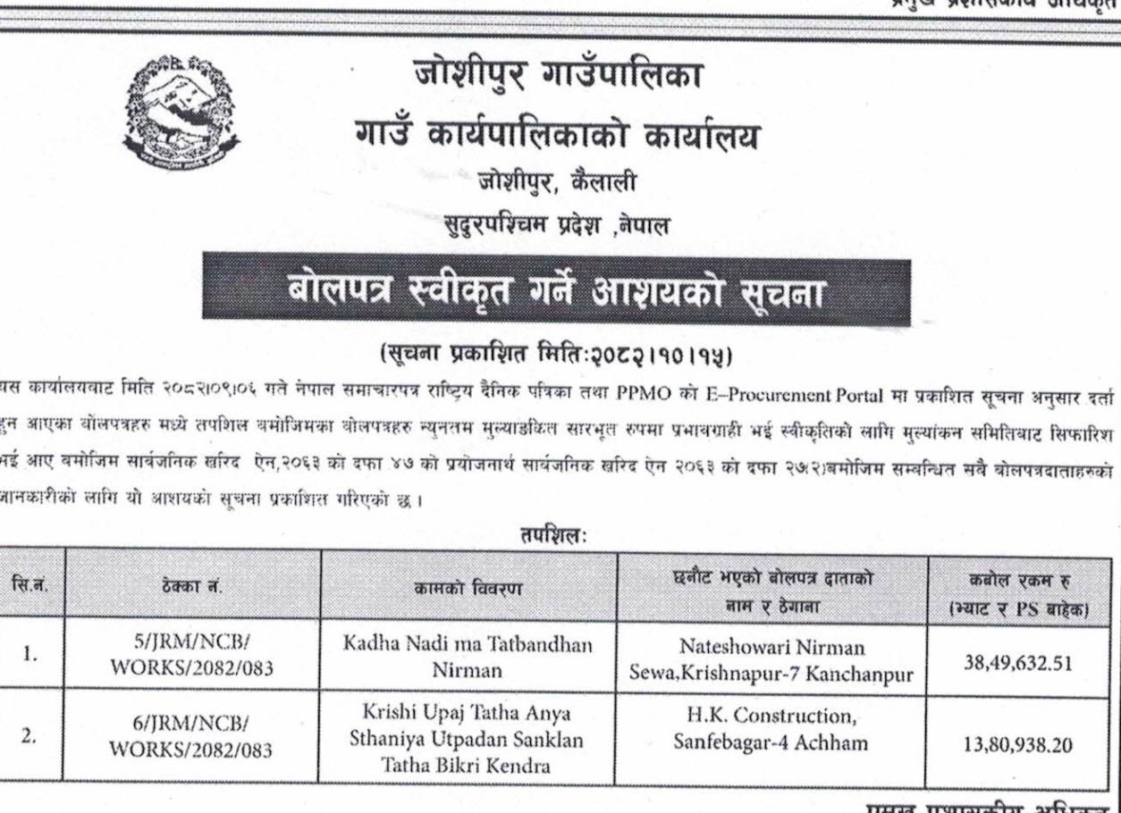 बोलपत्र स्वीकृत गर्ने आशयको सूचना ।