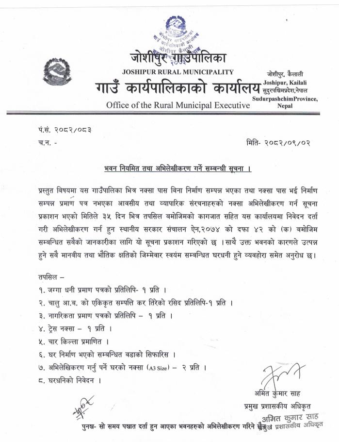 भवन नियमित तथा अभिलेखीकरण गर्ने सम्बन्धी सूचना।