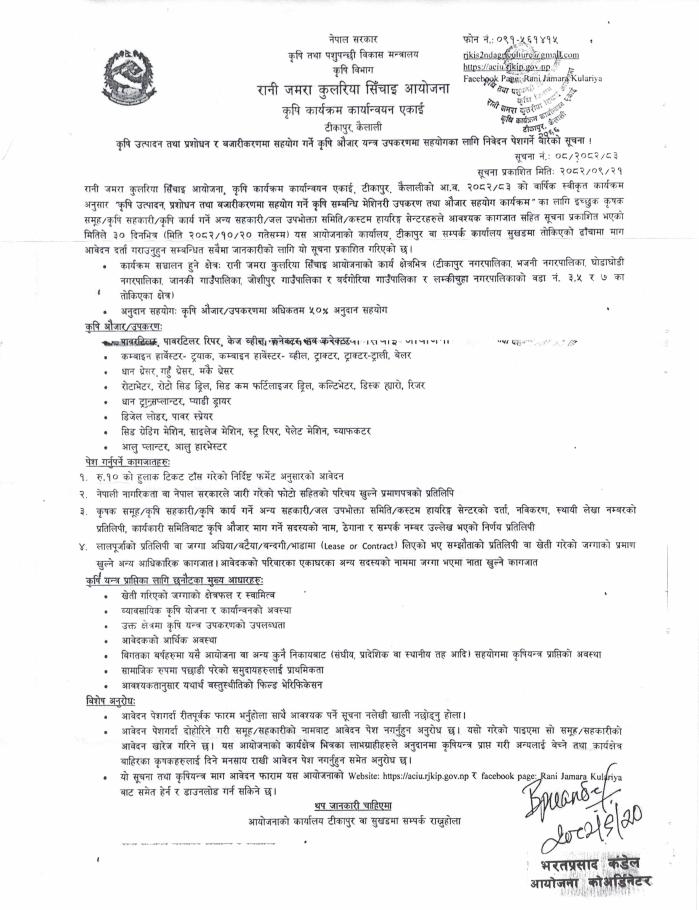 रानी जमरा कुलरिया सिँचाइआयोजनाको कृषि औजार यन्त्र उपकरणमा सहयोगका लागि निवेदन पेश गर्नेबारे सूचना ।
